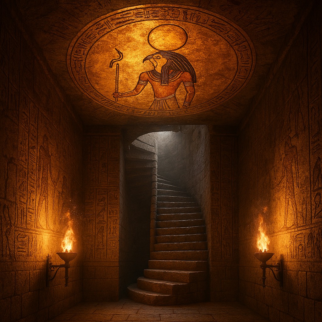 The sun plate clicks down and a door opens ahead. You enter a chamber with a golden ceiling painted with the sun god Ra. A spiral staircase winds upward through a shaft of light.